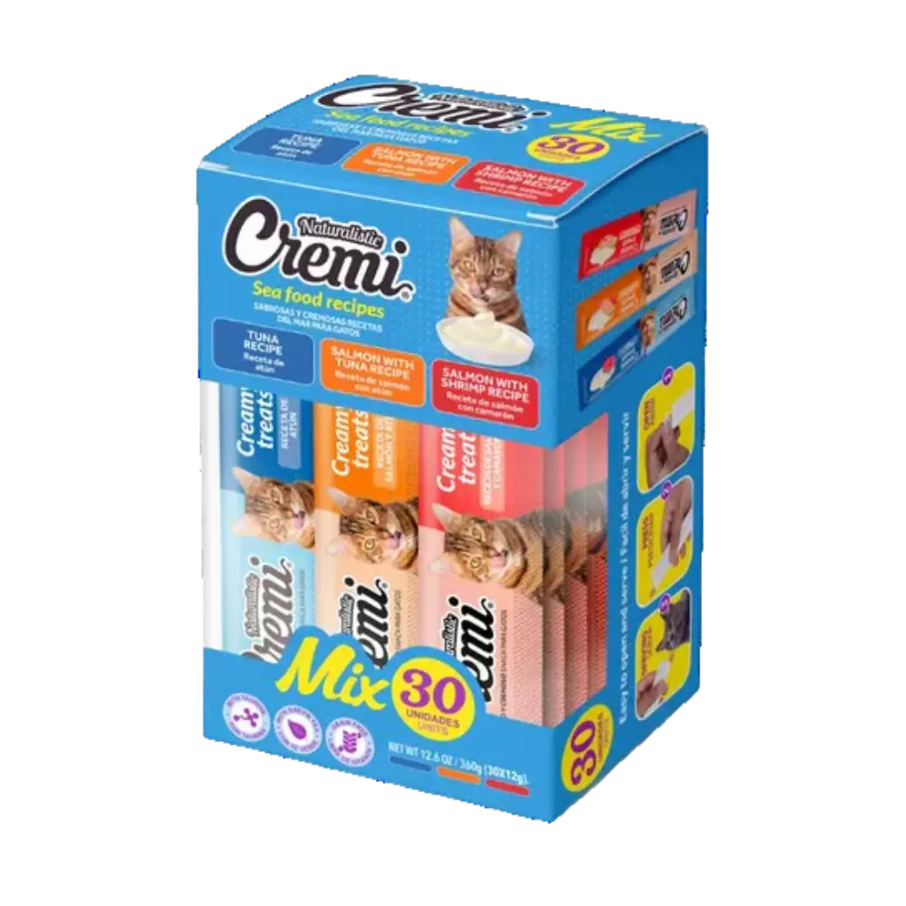 Increíble pack de 30 tubos de Cremi en un mix de sus variedades de Atún, Salmón/Atún y Salmón/Camarón. Elaborado con carne de atún, salmón y camarón, y reforzado con taurina, aminoácido esencial para los gatos. La fórmula además contiene extracto de té verde que tiene un alto poder antioxidante. El alto porcentaje de humedad promueve la hidratación junto con un aporte calórico controlado de sólo 6.9 kcal por tubo de Cremi. Excelente opción para utilizarlo con juguetes interactivos, congelarlo en épocas de calor o reducir el estrés al momento de dar un medicamento. Cremi es la mejor opción para fortalecer el vínculo con tu gato.