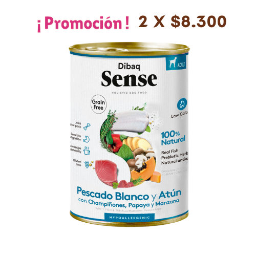 Lata Sense Pescado Blanco y Atún, Champiñones, Papaya y Manzana 380 gr